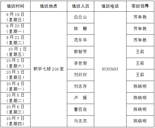 基础实验教学中心2021年中秋节、国庆节值班安排表